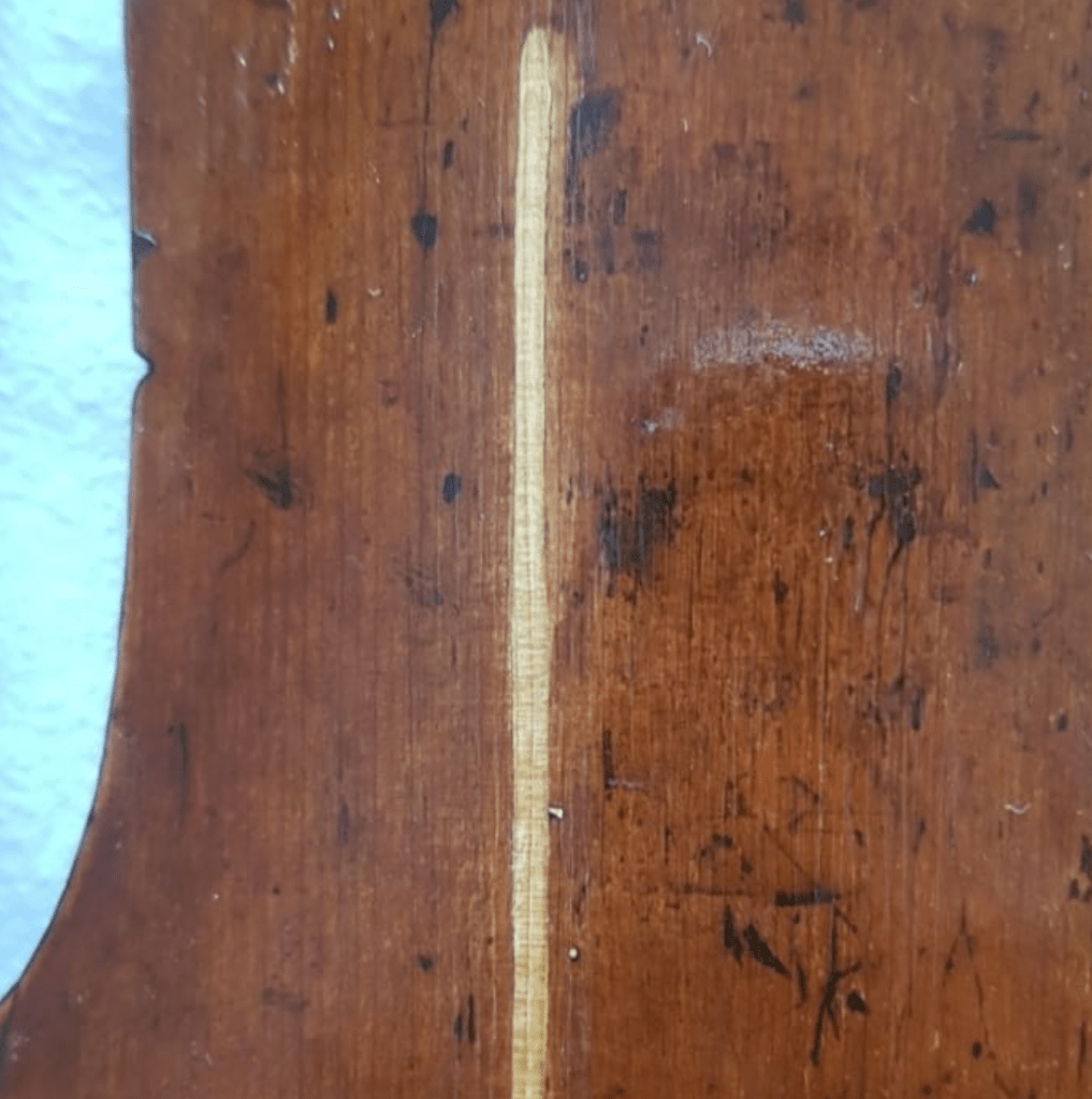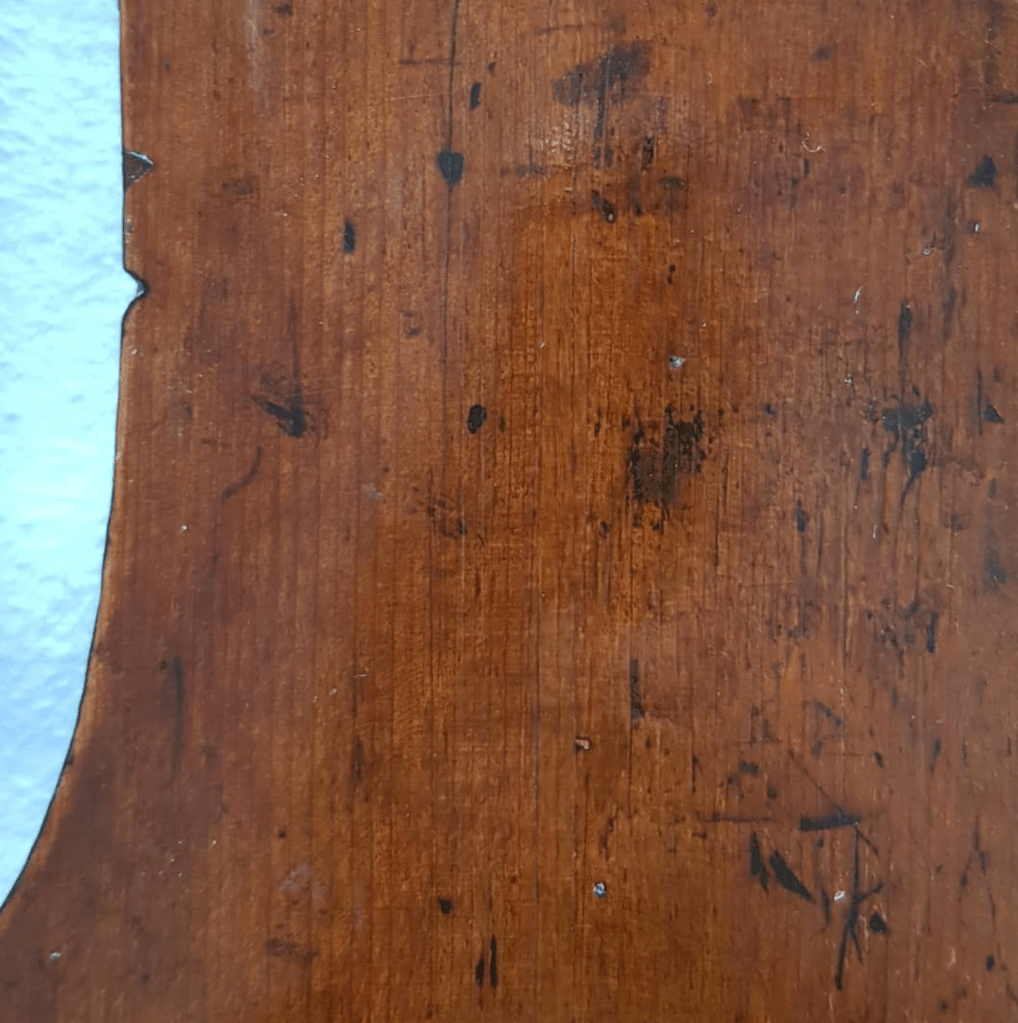 Due to the f-holes having been moved in the past, the different bridge position areas were very pronounced, so have cleaned, filled and retouched them for now. Once the new bridge position has been established, a bit of the retouch will probably be removed again around them to give the area more of an authentic look.