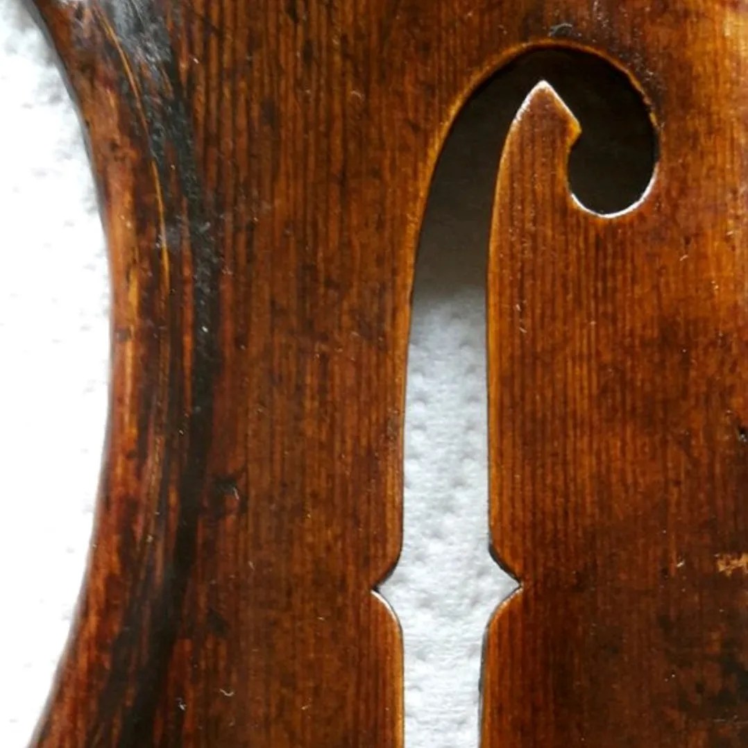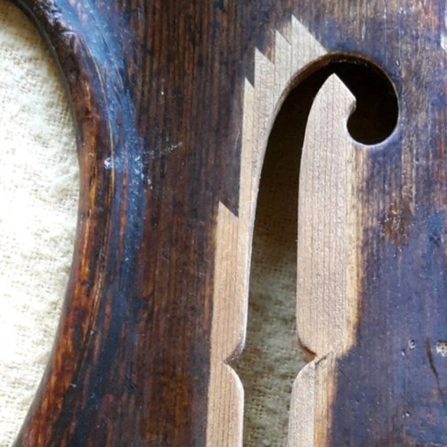 These photos show an f-hole restoration from a while ago after the f-holes had been re-cut at some stage. Some repair pieces had been inserted previously using this same “tooth” method. It avoids butt joints and with short, staggered spikes, it’s easier to distract the eyes from the joints.