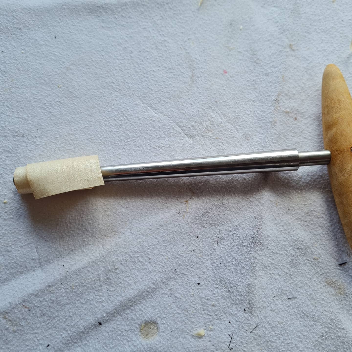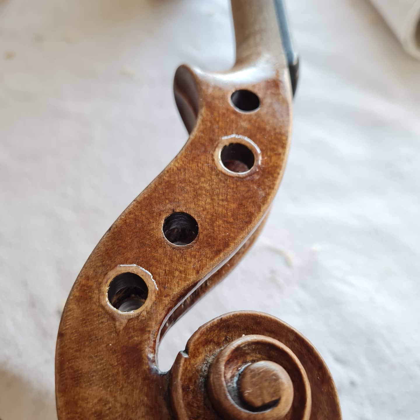 Thick maple shavings soaked in hide glue get wrapped around the soaped mandril and pushed inside the cleaned-up peg holes and when dry, reamed out slightly to get that perfect taper to match the pegs. I have to admit that this is one of my least favourite jobs as it’s messy and fiddly.