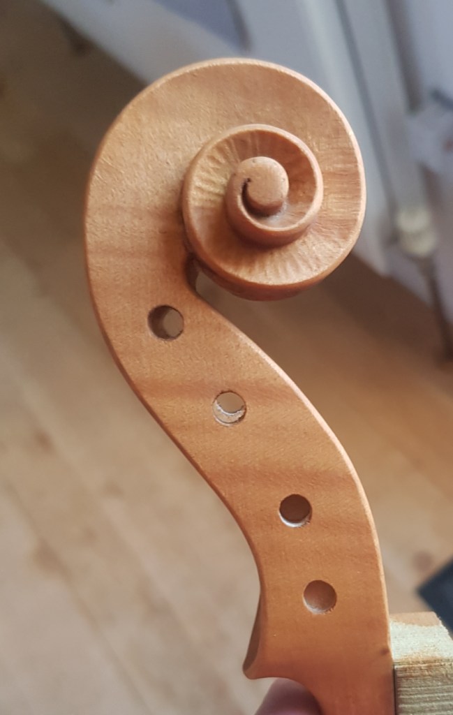 So this is turning into a bit of a joint project. Tony varnished the violin and has now started removing some of it while I had a go today at retouching and applying patina to the scroll.