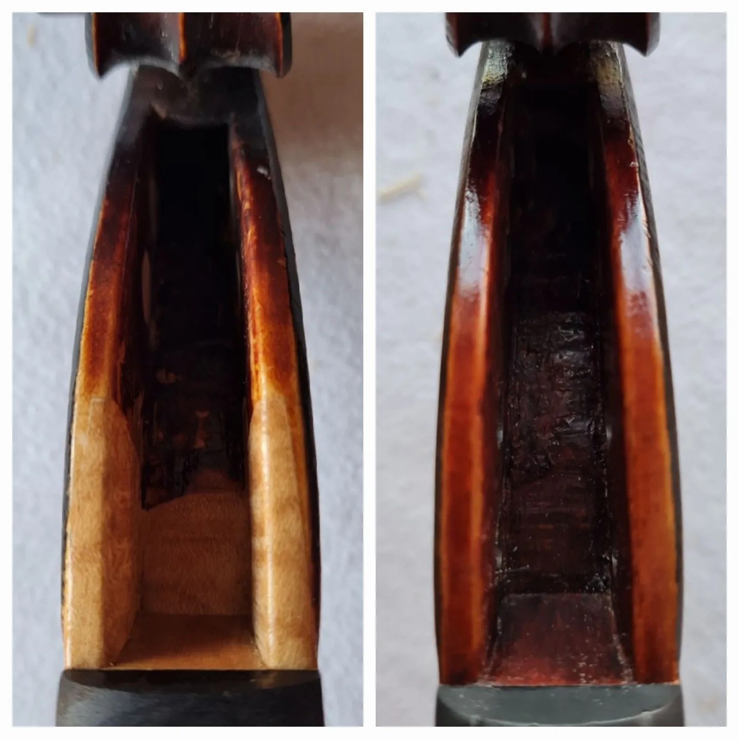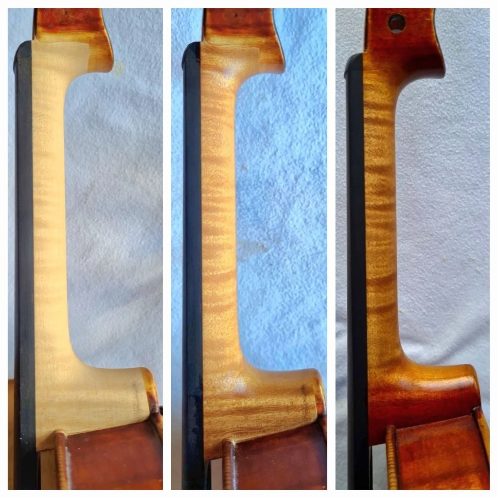 These are a few photos of the progression and finish of the neckgraft staining and retouching on a violin I delivered to London yesterday.