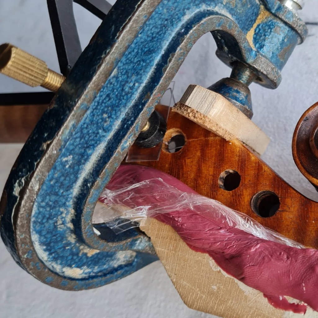 Ready to drill new holes and fit the pegs after dealing with the crack and fitting maple endgrain bushings.