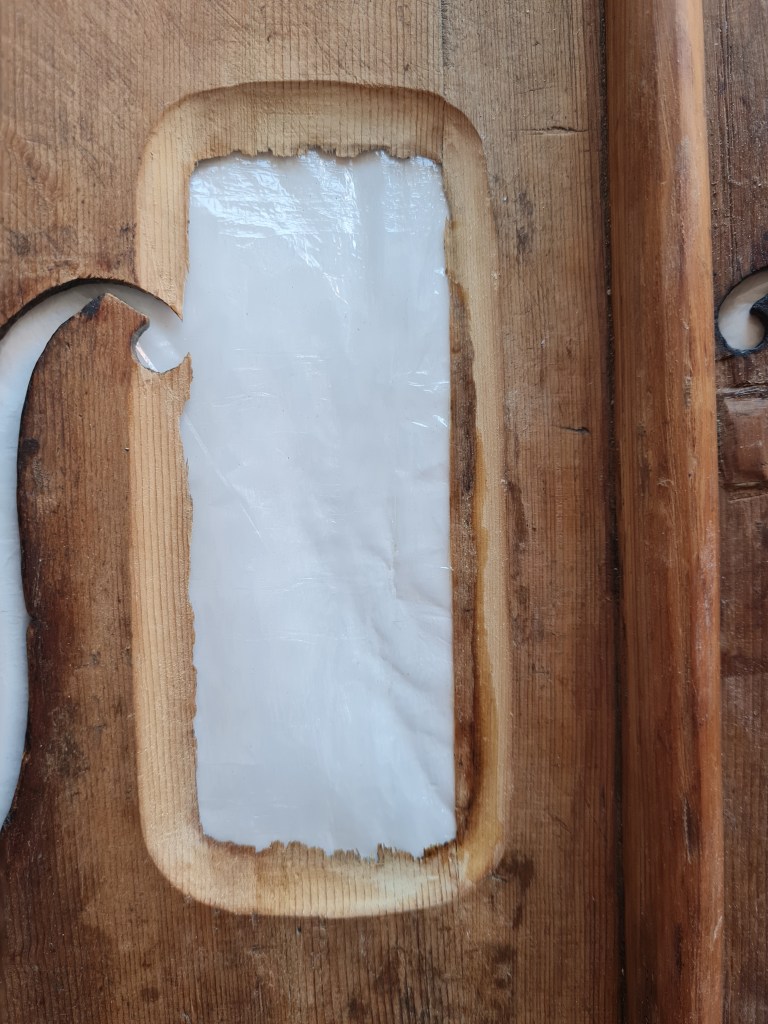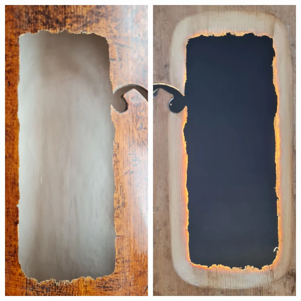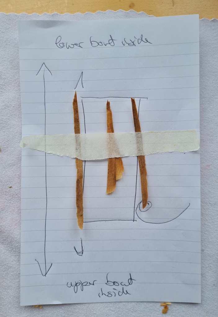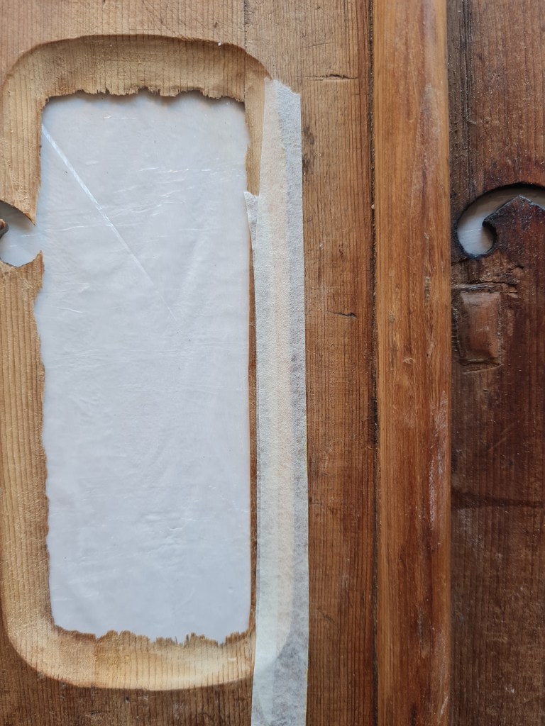 Photo 9 & 10: The glued shaving viewed from the inside and the outside, now covering the area up to the centre joint.