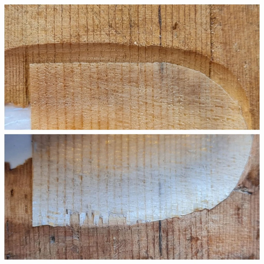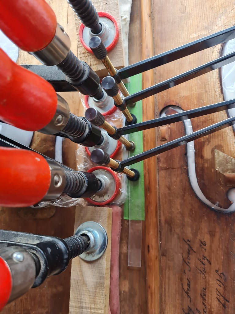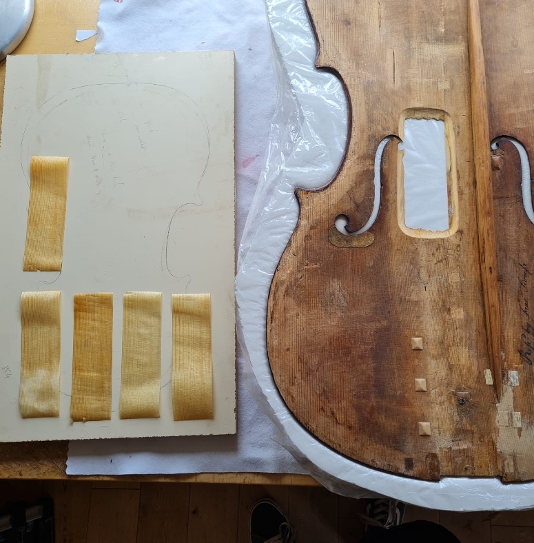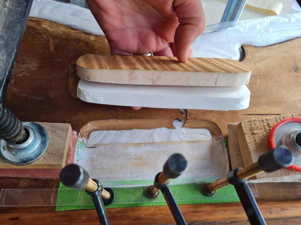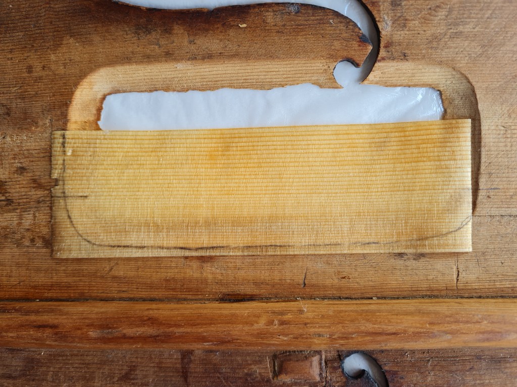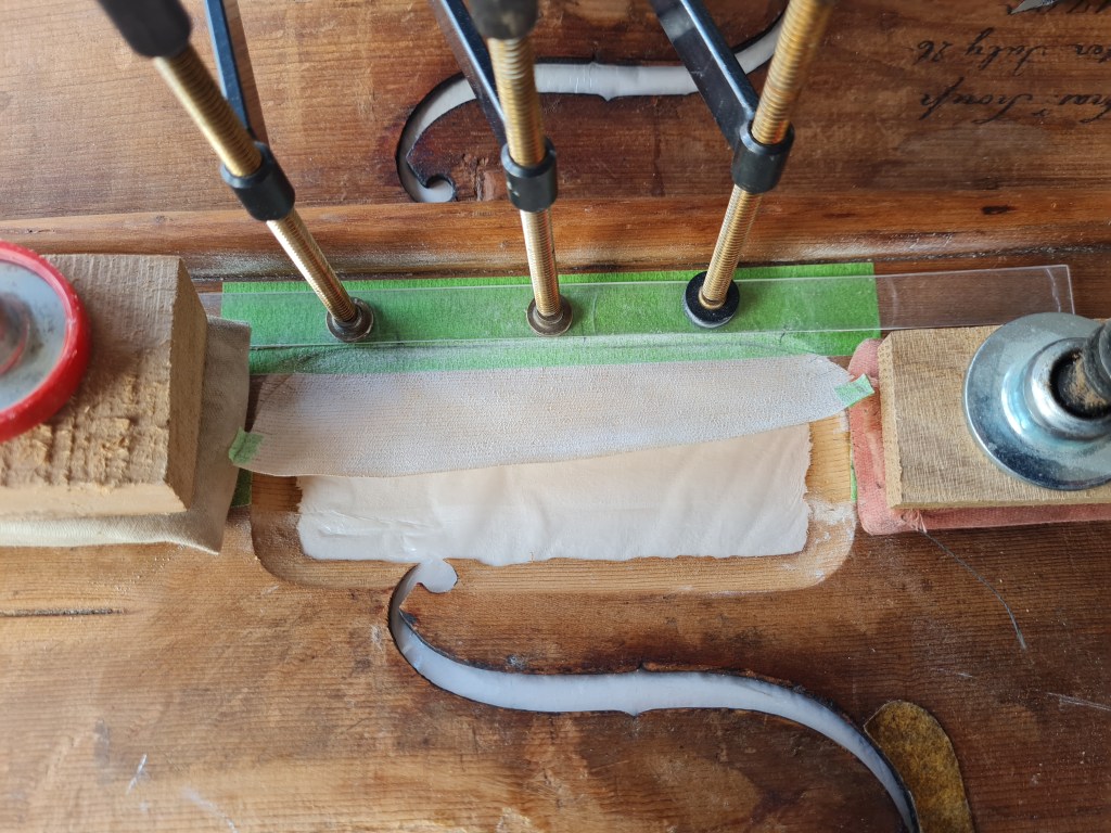 As the patch area is really large, the counter-form had to be chalk-fitted along the gluing surface of the shaving to give maximum pressure in the right area.