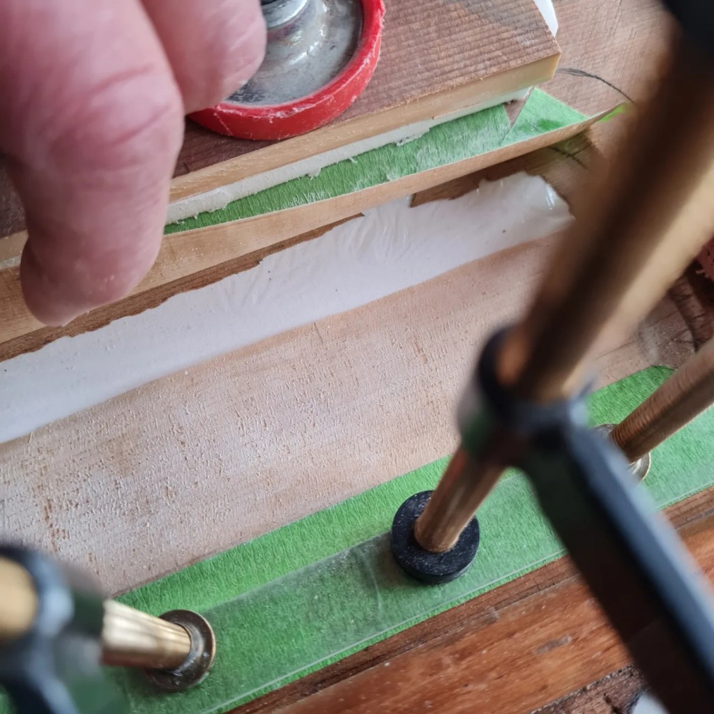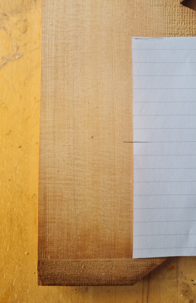 After gluing that first large shaving in, I realised that the original grainlines were bowing towards the centre joint and my shaving was doing the opposite. In the photo on the left, the edge of the lined paper follows the original grainlines. I hadn’t paid enough attention to looking along the grainlines at a low angle from which it became very obvious. Not good enough!