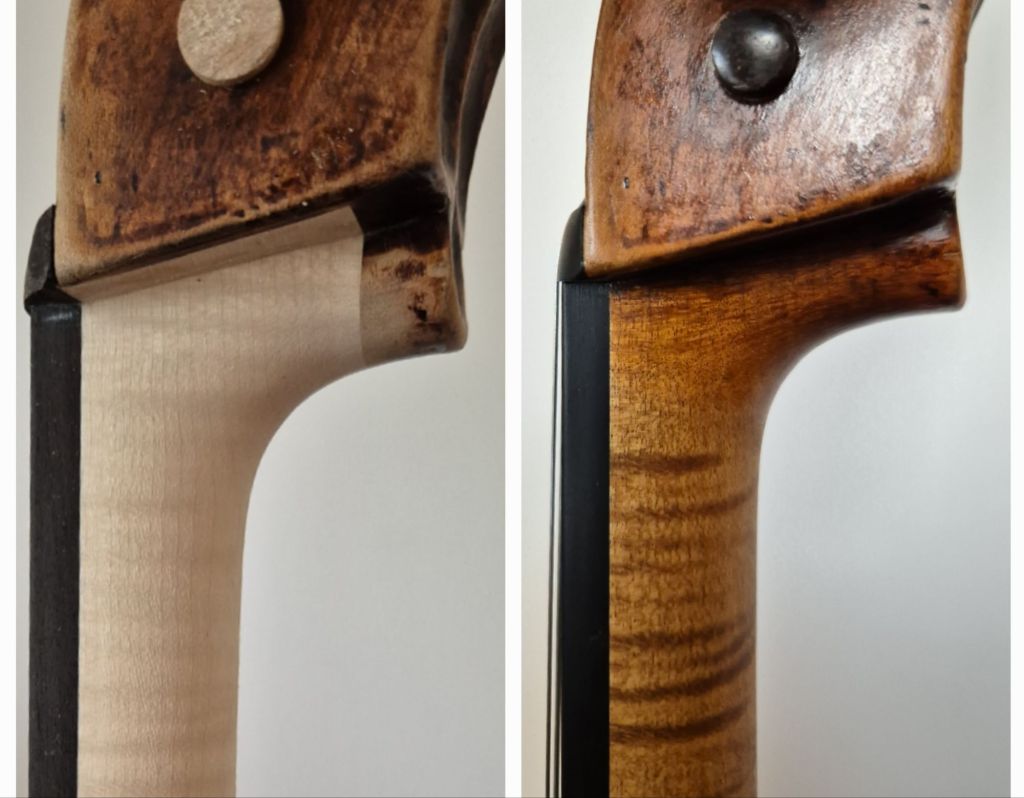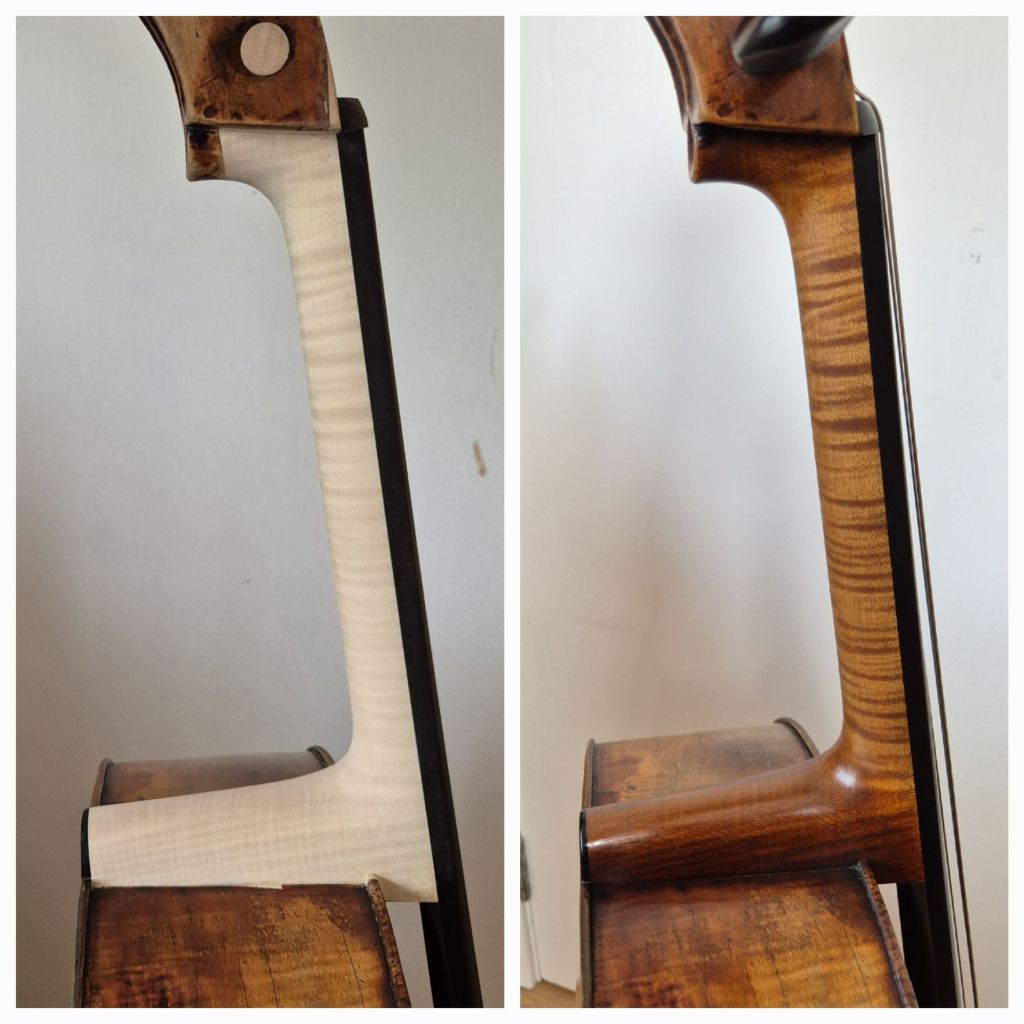 I’m not keen on stopped neckgrafts but for the preservation of original wood, I replaced like for like. I found the sanding disc worked a treat for the endgrain at the top of the graft!