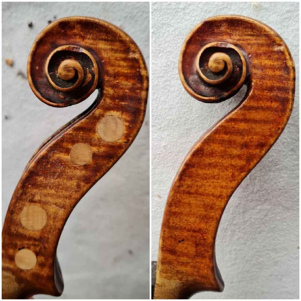 A little tidy-up where a piece had been fitted previously against the rib by cleaning the joint, removing old retouch, levelling with filler varnish and applying new retouch over the top.