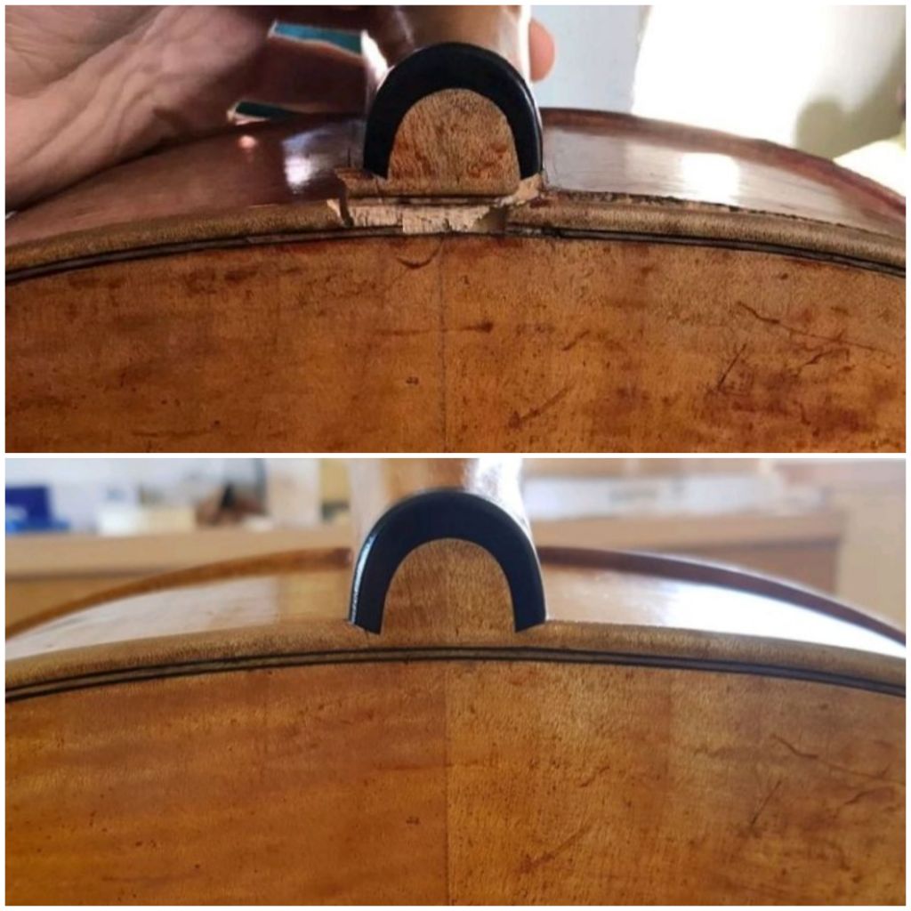 This cello neck got a knock and the button was ripped out still attached to the neck.