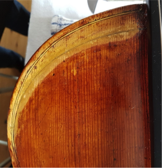 Once I was happy with the texture, I put a thin coat of clear spirit varnish over the area with a flat, wide brush. Using a fine-pointed sable brush, I then continued the retouch by re-enforcing the grain-lines further, fading them out into the summer growth and painting them beyond the purfling over the edge. It is best to retouch with a fairly dry brush and to use as little varnish as possible. I then sealed the retouch in with a few thin, clear coats of spirit varnish. It is important to match the gloss-matt value of the retouch to the surrounding varnish from the start. A few distress marks and some patina helped the final completion of the area.