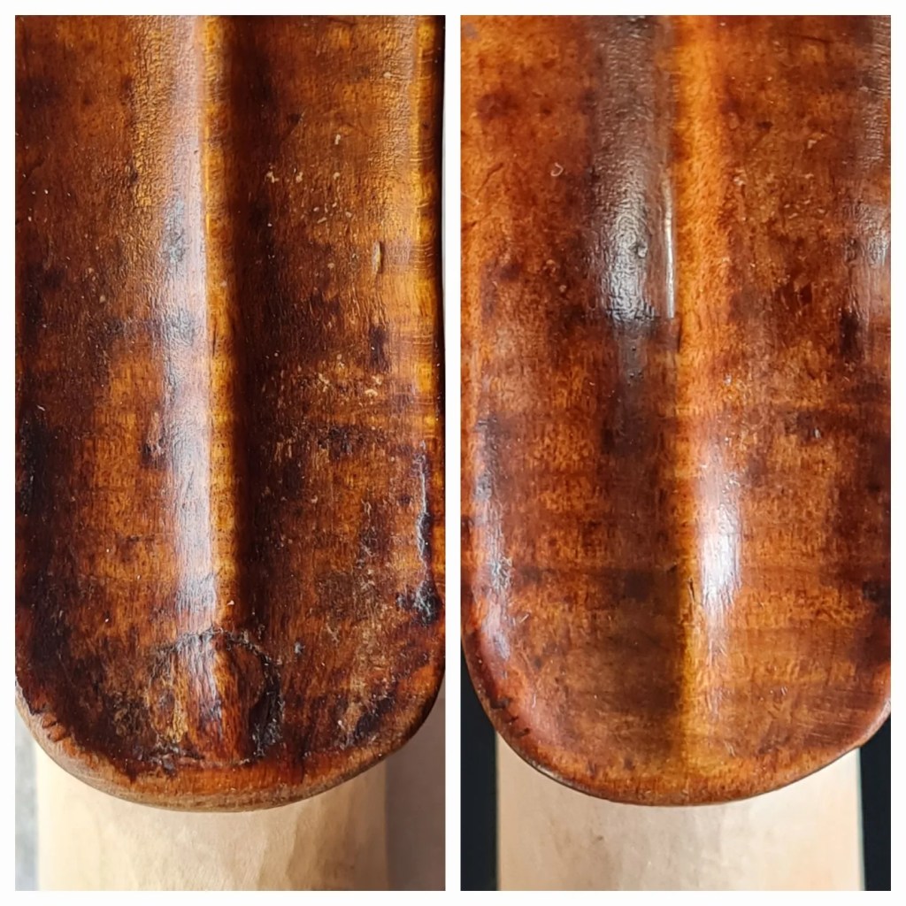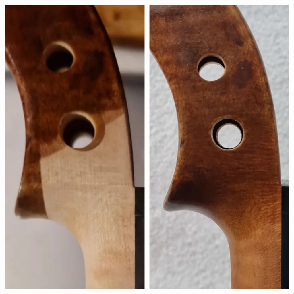 Today, I finally got to finish the retouching on the neckgraft I had posted about before where the pegbox walls needed to be extended.