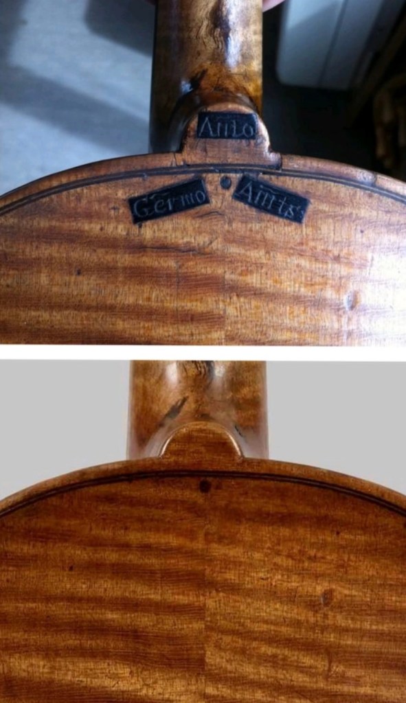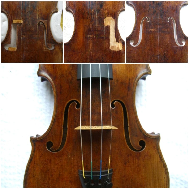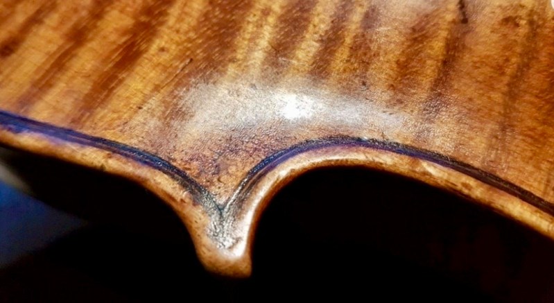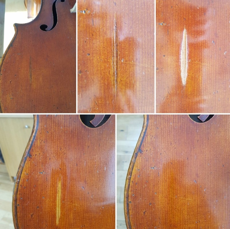 A standard restoration would include taking the front and the back off the ribstructure to deal with cracks, making plaster casts to help with patches, a neckgraft, pegbushes, new set-up etc. I take particular care in the texture and retouching of the instrument once all the woodwork is completed.